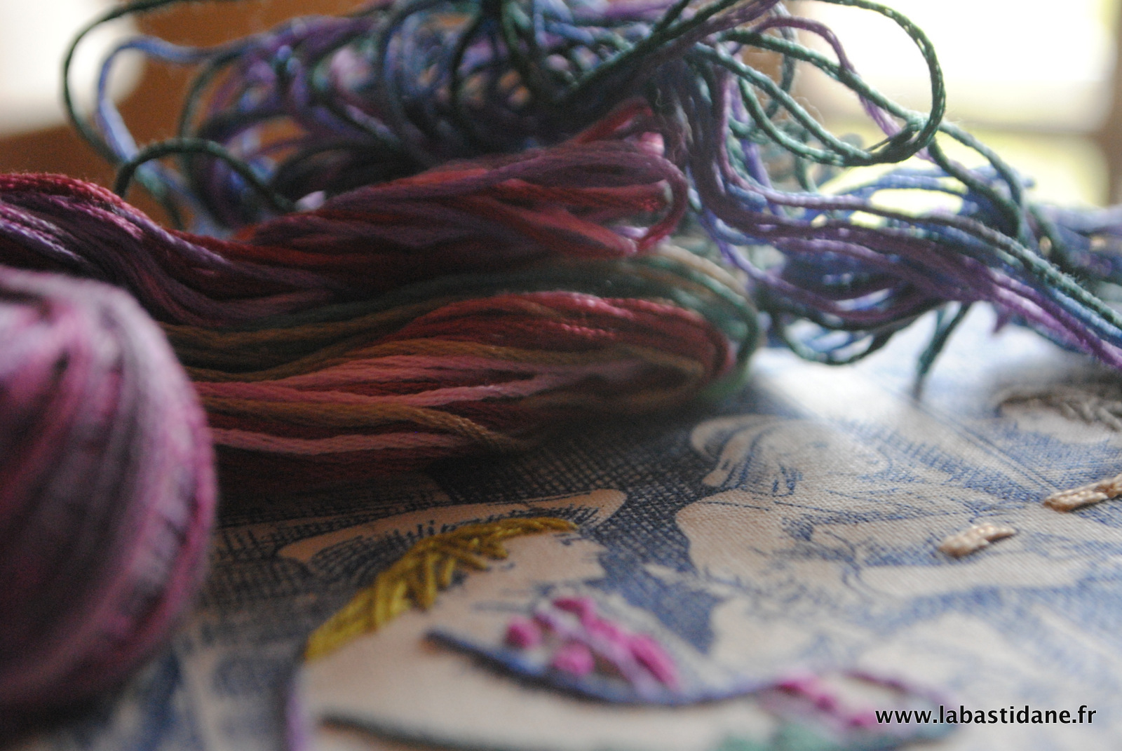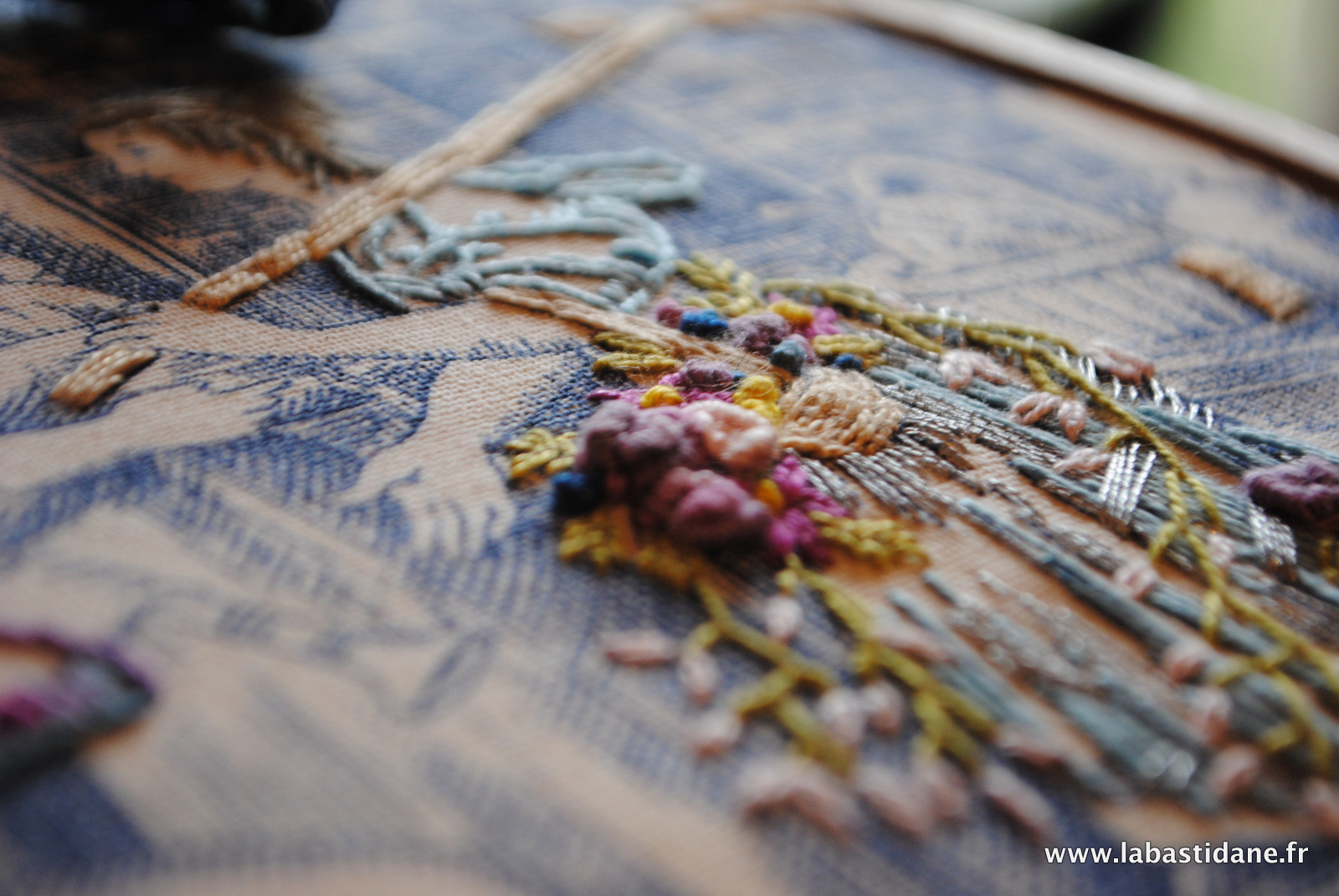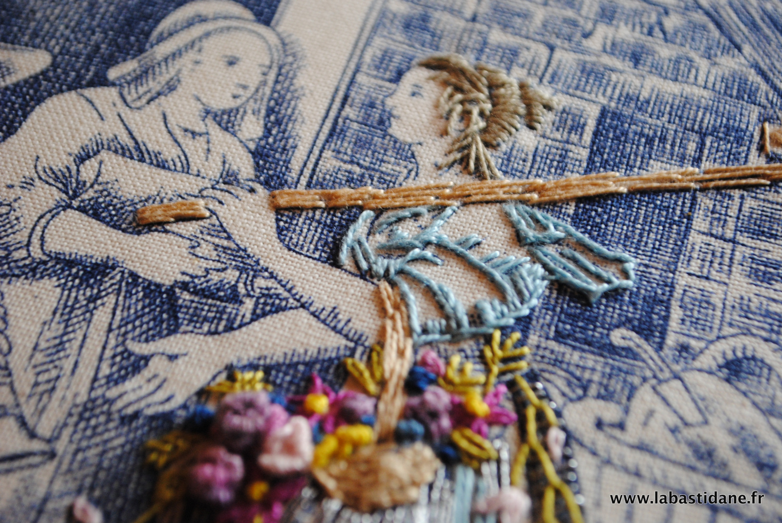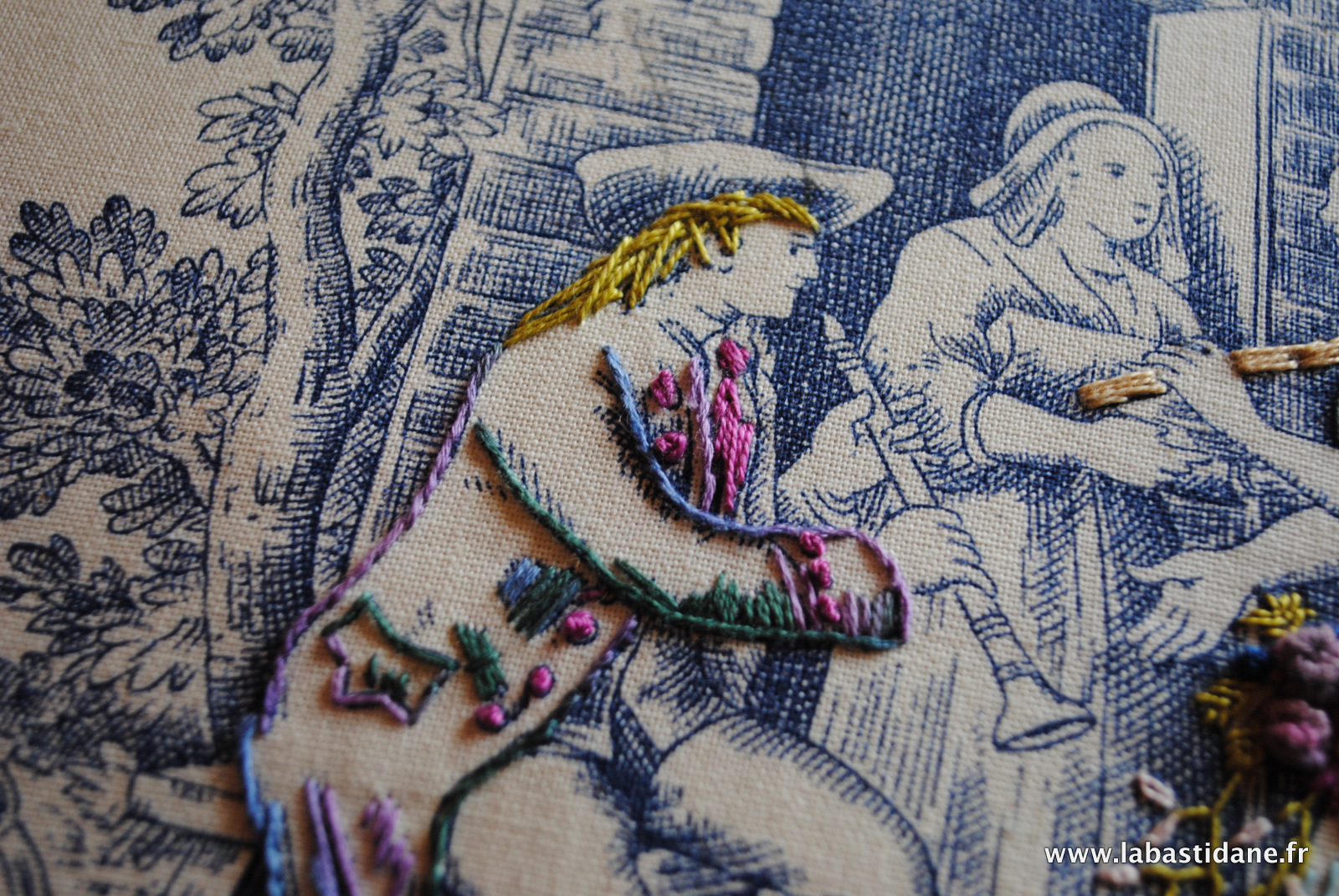 J’aime beaucoup la toile de jouy ainsi rebrodée et relookée.Les personnages prennent vie .
