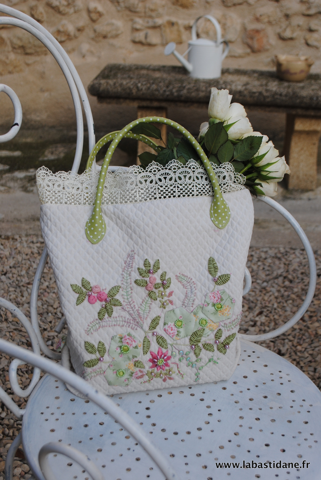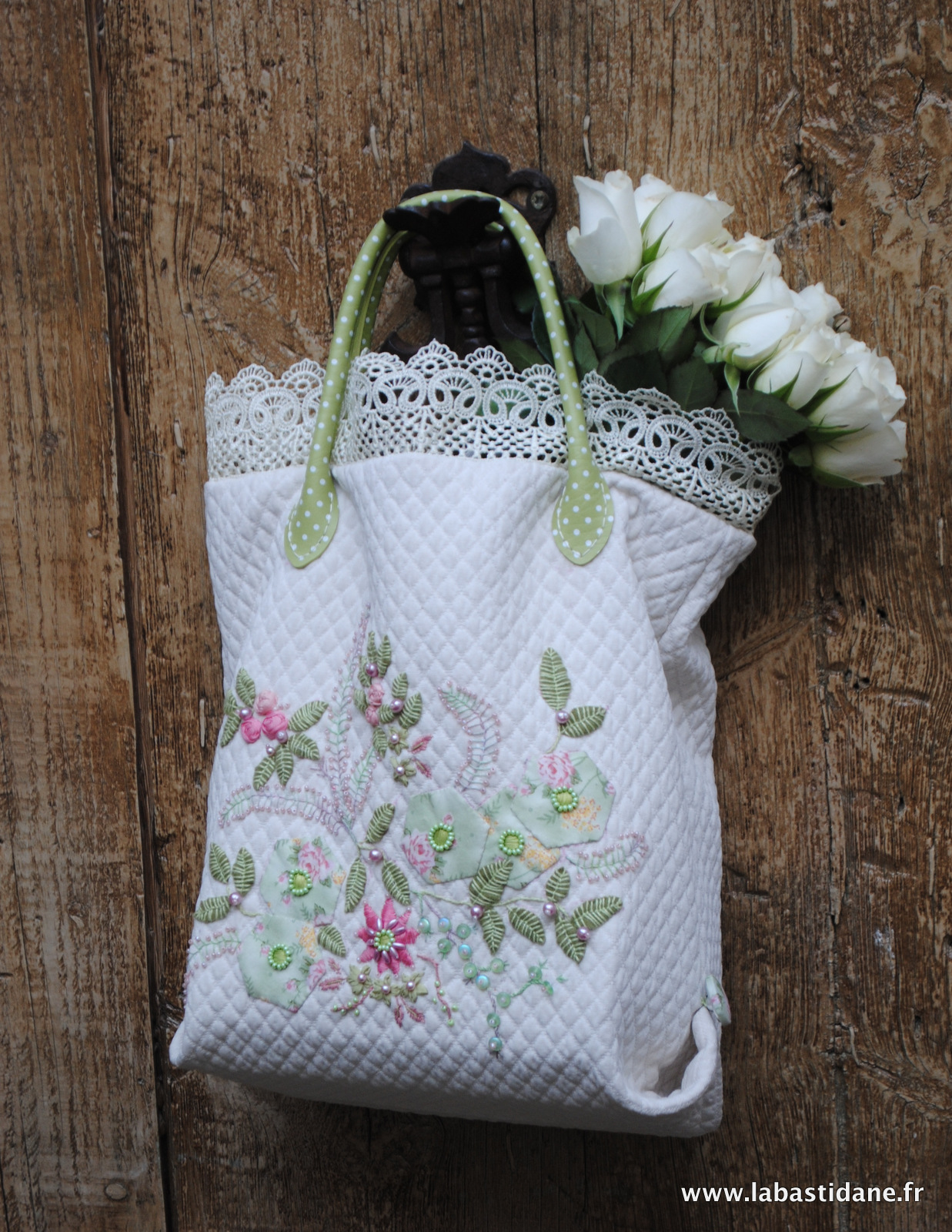 Du piqué de coton, un imprimé fleuri et quelques hexagones qui se sont posés tels des papillons brodés, et une envie de créer un sac frais et délicat comme une journée de printemps.
