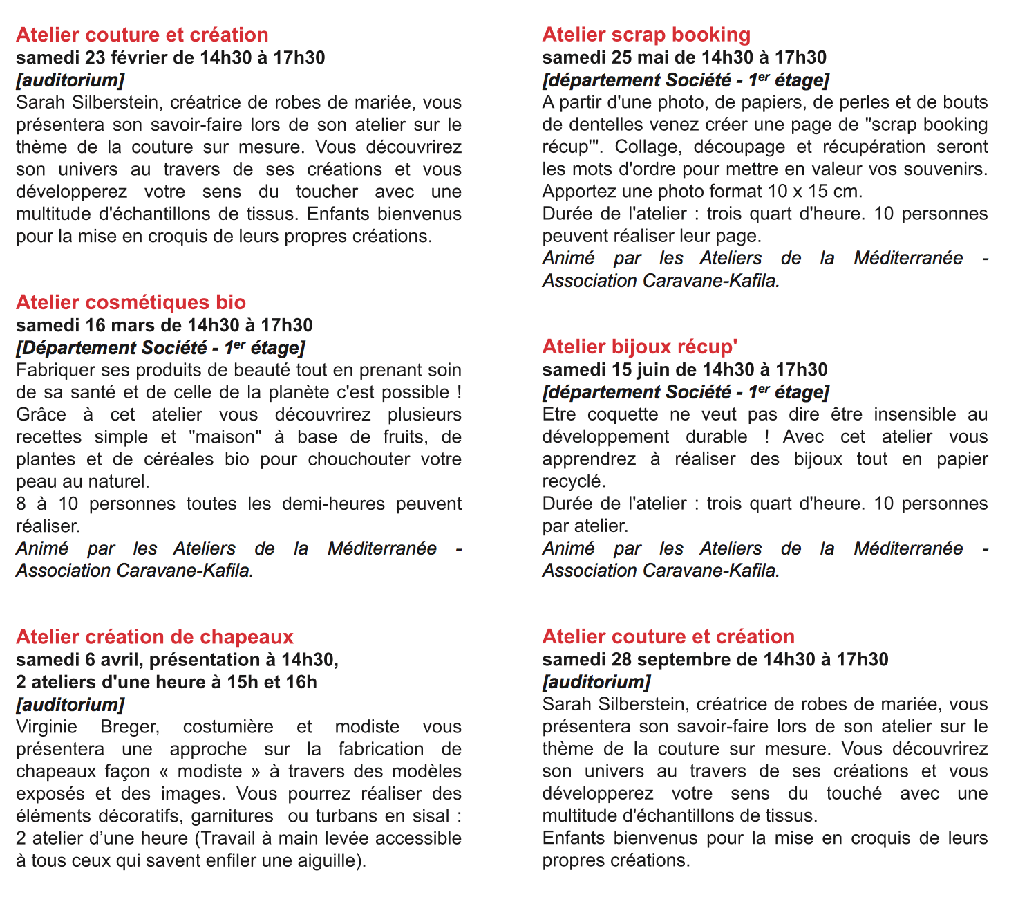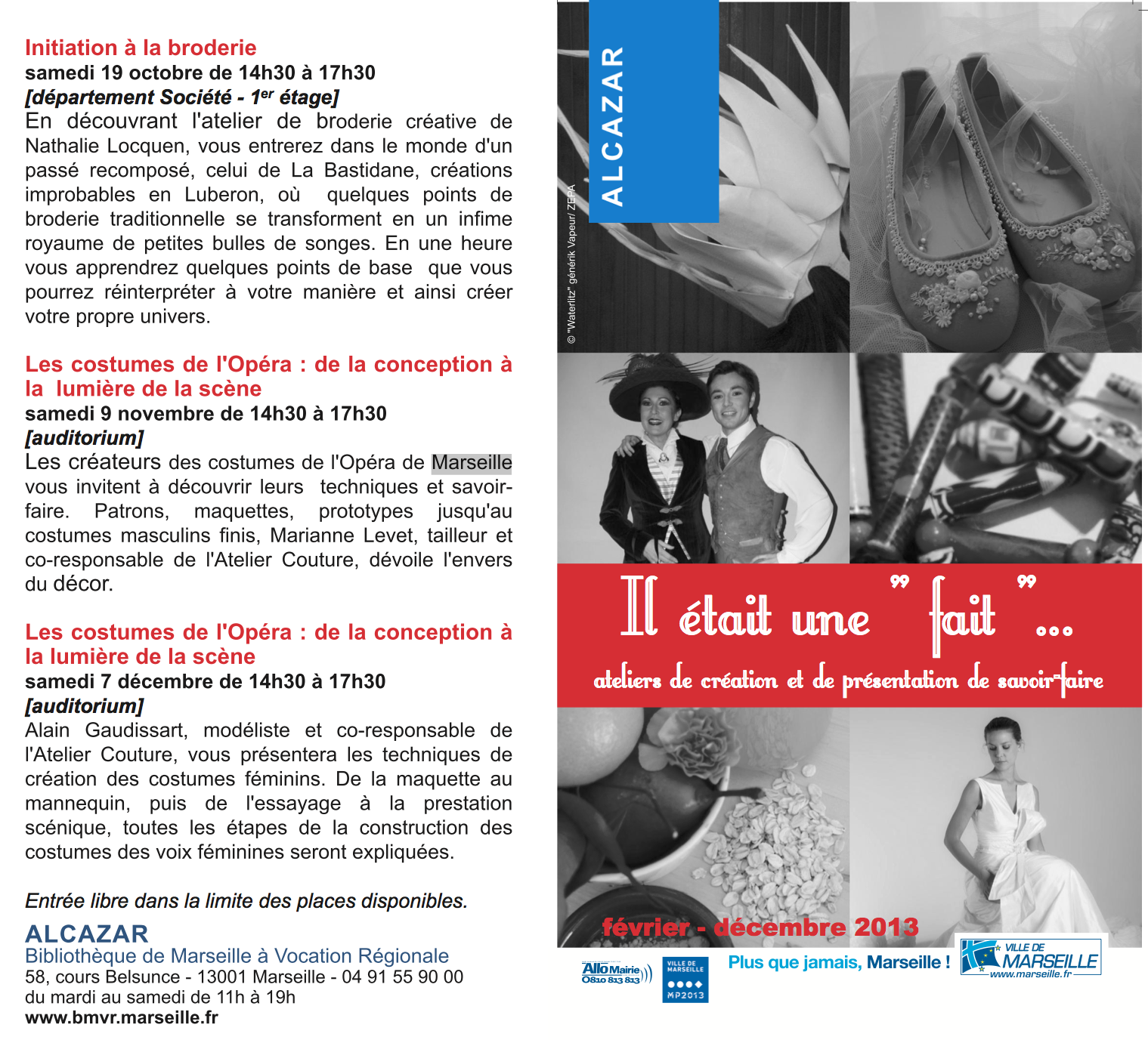 Atelier de création et de présentation de savoir faire à la bibliothèque de l’Alcazar (ce lieu mythique de la culture marseillaise) à Marseille, je serais présente le 19 octobre pour une atelier broderie, il y aura de nombreuses créatrices, je vous laisse découvrir le flyer ainsi que les artistes et associations qui seront présentes, modistes, costumières de théâtre, bijoutières, créatrice de robe de mariés.