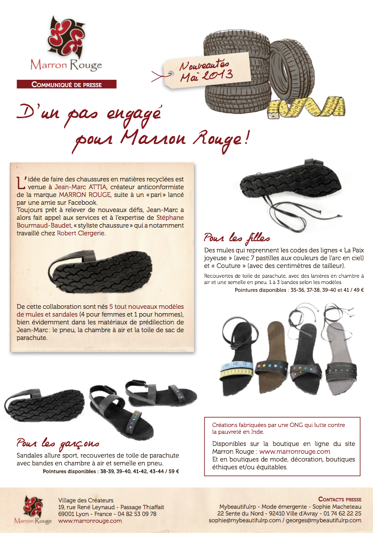 Aujourd’hui je suis fière d’être la marraine d’une mini collection de chaussures de cette société, la marraine pourquoi, me direz vous ? Parce que j’ai une idée à la minute, et qu’un délire sur facebook avec le créateur de Marron Rouge et un styliste renommé Stéphane Bourmaud Baudet dans le domaine des chaussures, ancien de chez Robert Clergerie, photographe et artiste, est devenu pour ces derniers un défi, un défi qu’ils ont relevé haut la main, créer des chaussures en matière recyclée, élégantes et confortables, à un prix tout mini.