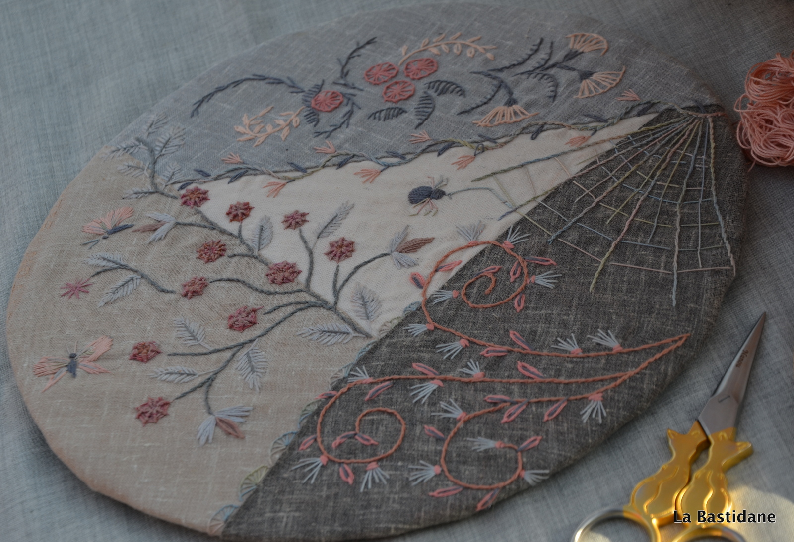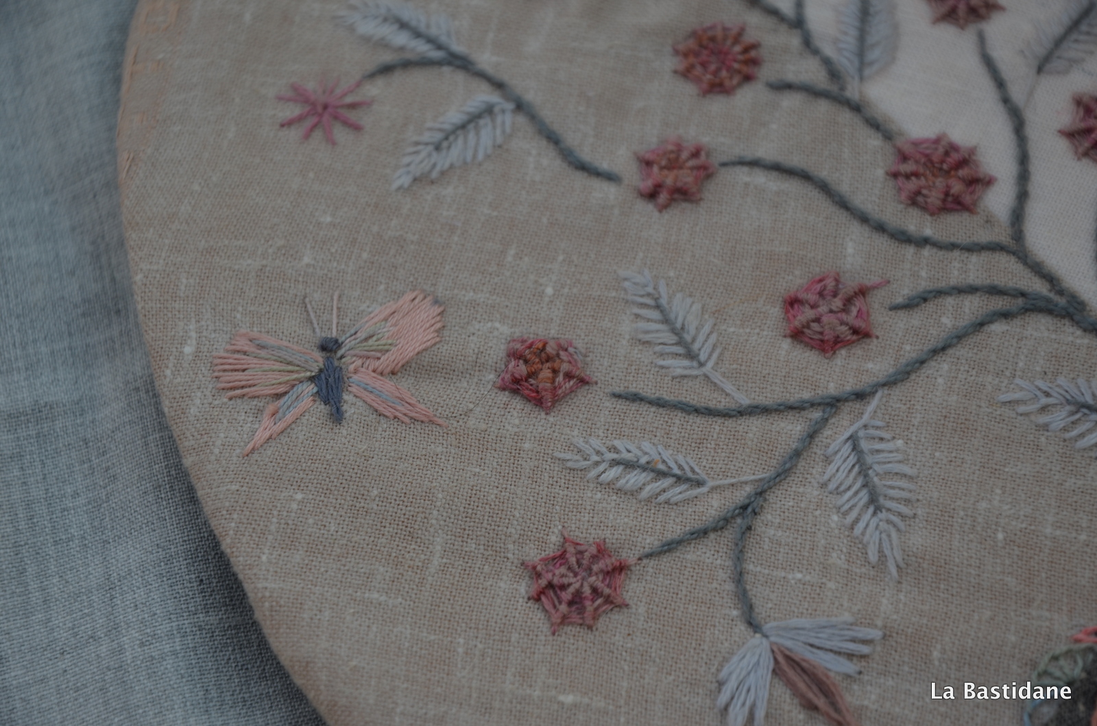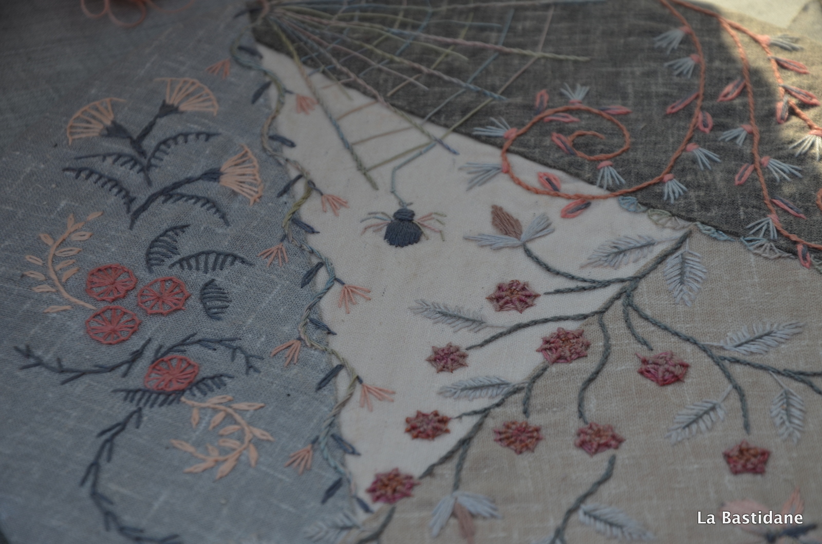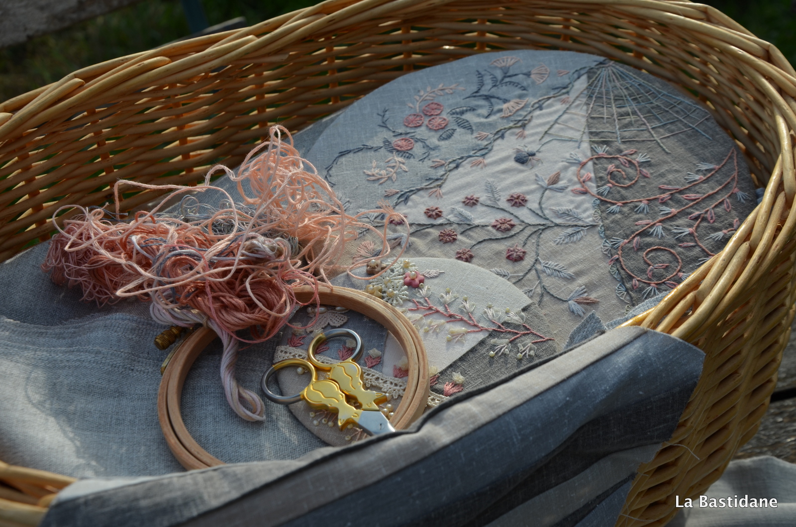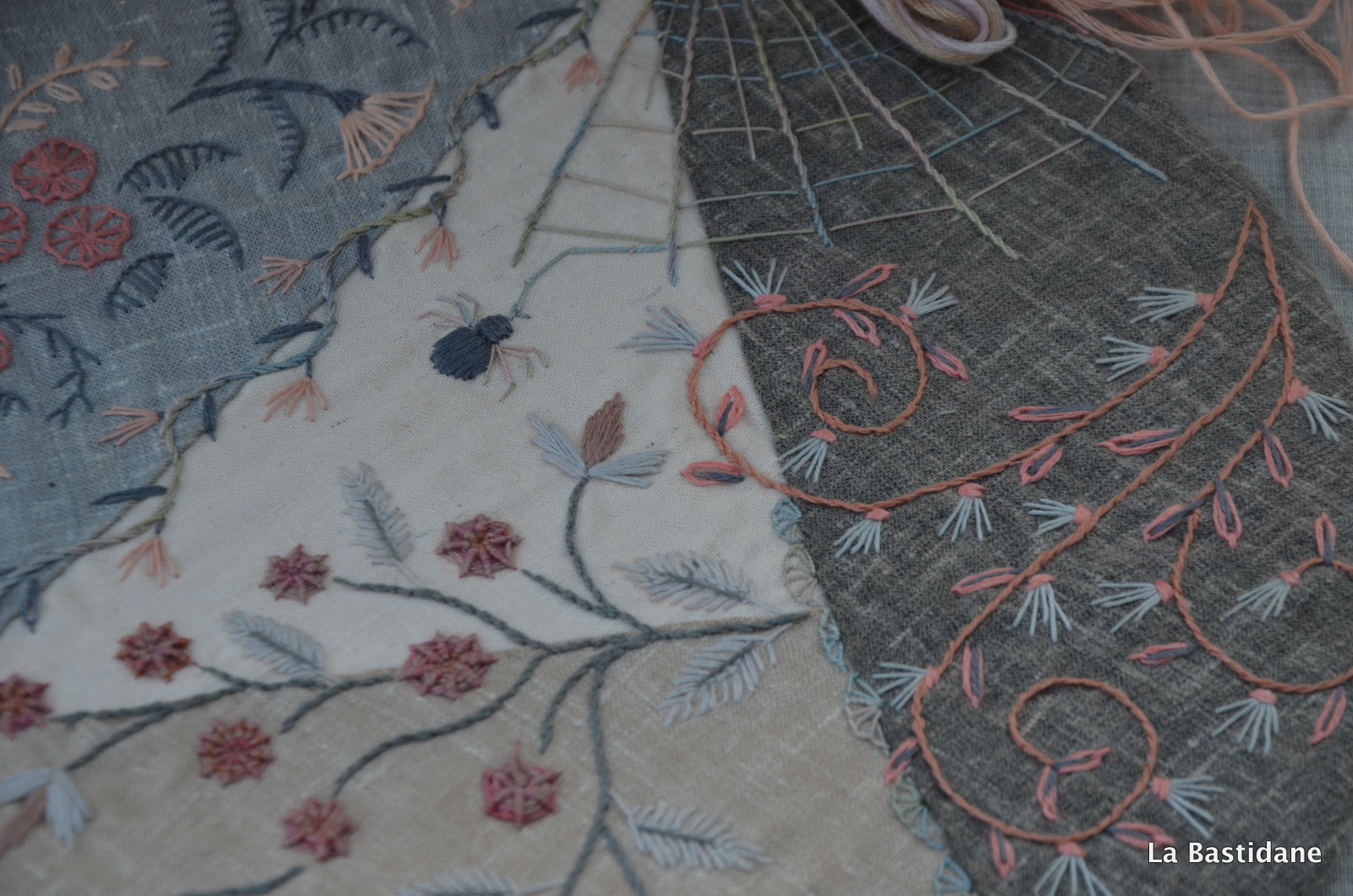je n’ai utilisé que des fils à broder, pas de dentelle, pas de perle, pas de rubans de soie … pourquoi ? Parce que des nouveaux matériaux apparaitront au fil des mois, chaque mois un matériel différent à inclure dans mon CQJP …