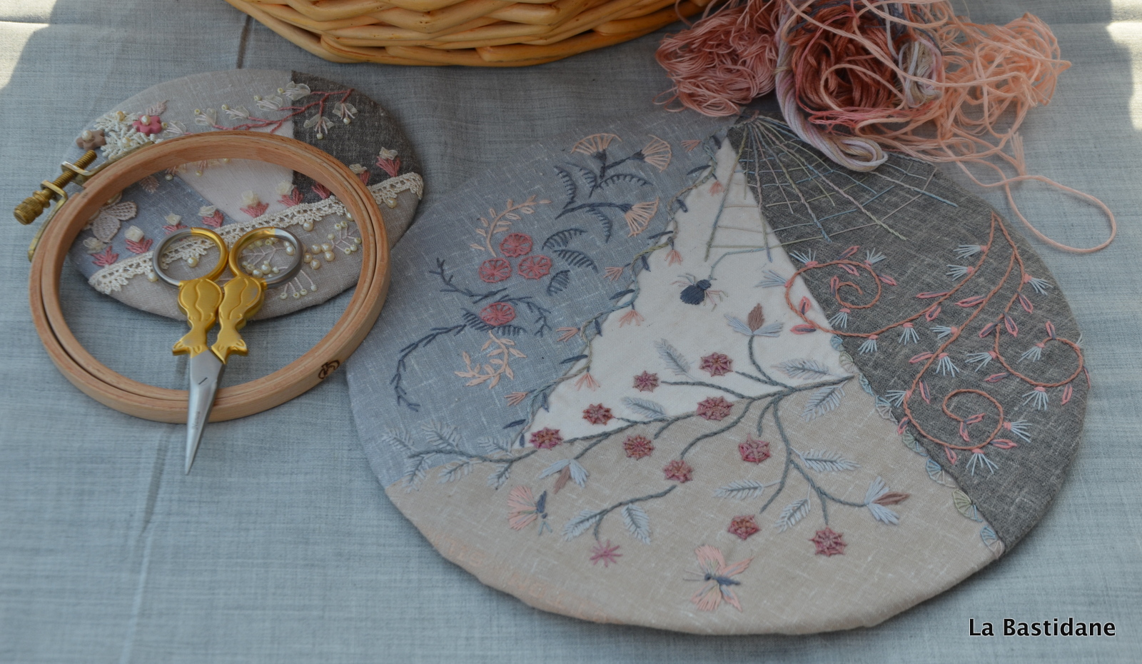 Je me suis inspirée d’un petit cd que j’avais fait pour donner un atelier de crazy quilt à Marseille pour le salon création et savoir faire en 2013, et j’ai décidé tout au long de l’année de faire des cercles plus ou moins grands, celui ci mesure 24 cm de diamètre … le prochain, je ne sais pas.