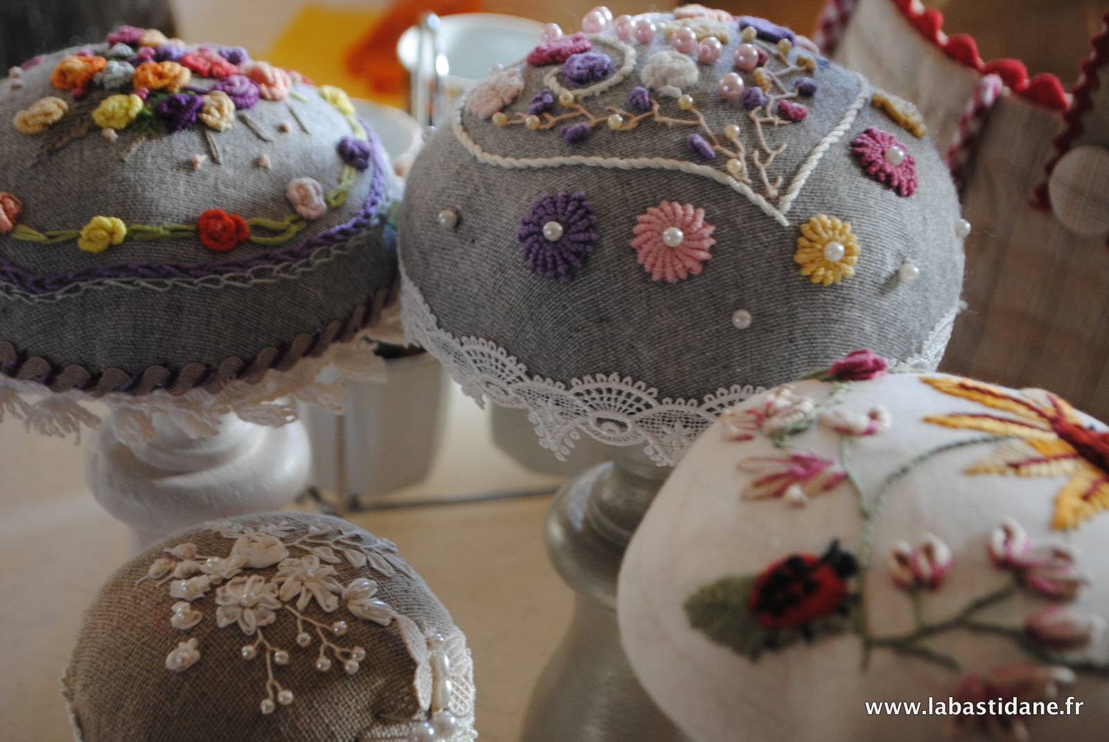 J’adore ces champignons pique-aiguilles, c’est une très belle idée (mais tu n’en manques jamais). Je craque complètement pour celui aux petites roses multicolores. Bravo à l’inventrice !