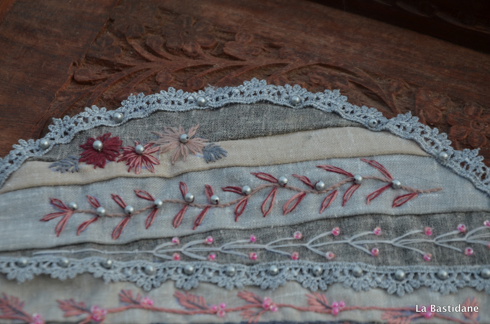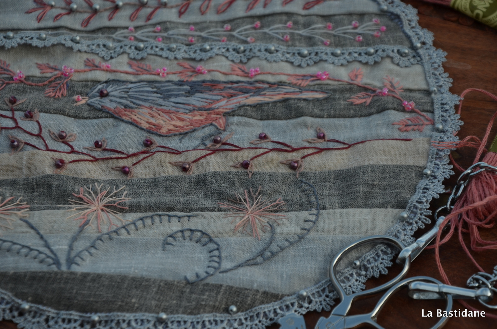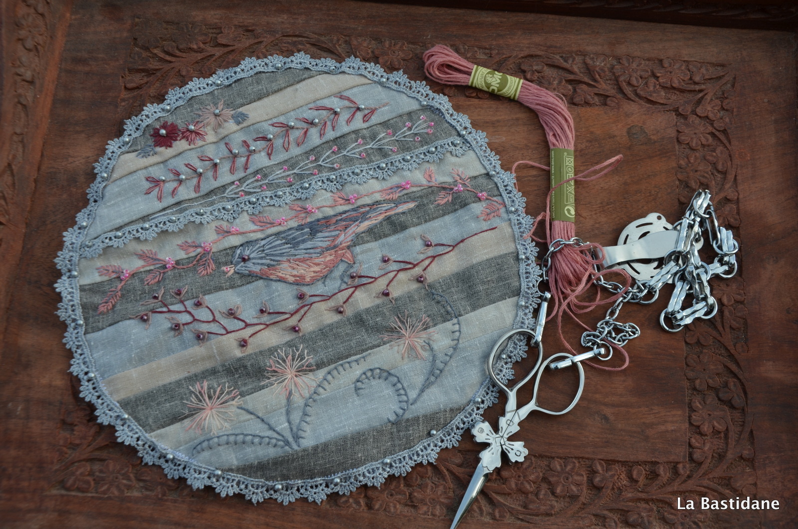 Un oiseau s’est posé sur mon crazy, le même tissu, et les mêmes tons que celui de janvier, je vais essayer de faire des cercles de différentes grandeurs, dans les mêmes tons. J’avais envie de faire du crazy avec des bandes, pas très académiques, j’aime le résultat .. au moins prochain, si je survis à l’organisation d' »Aiguilles en Luberon » ?