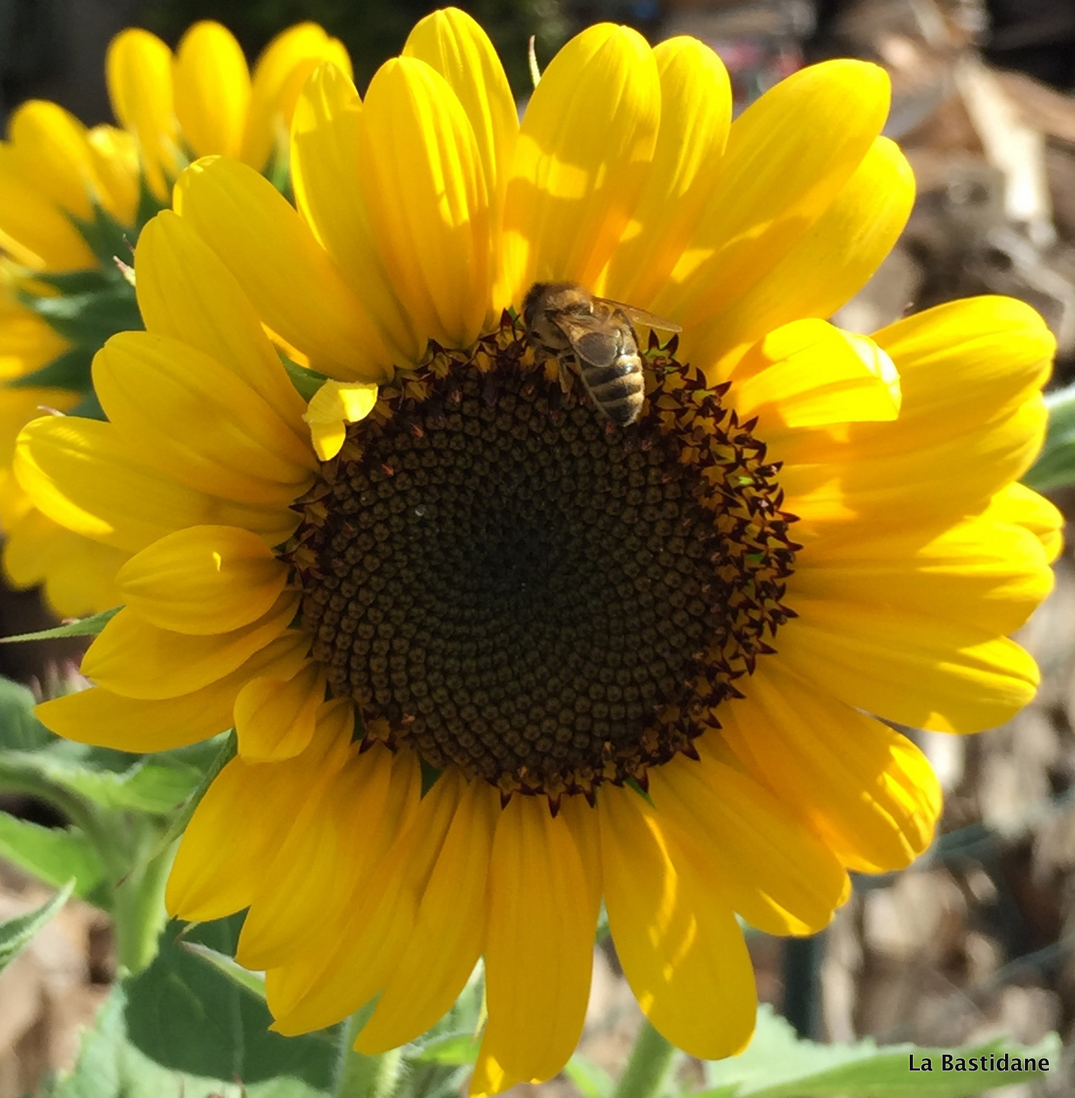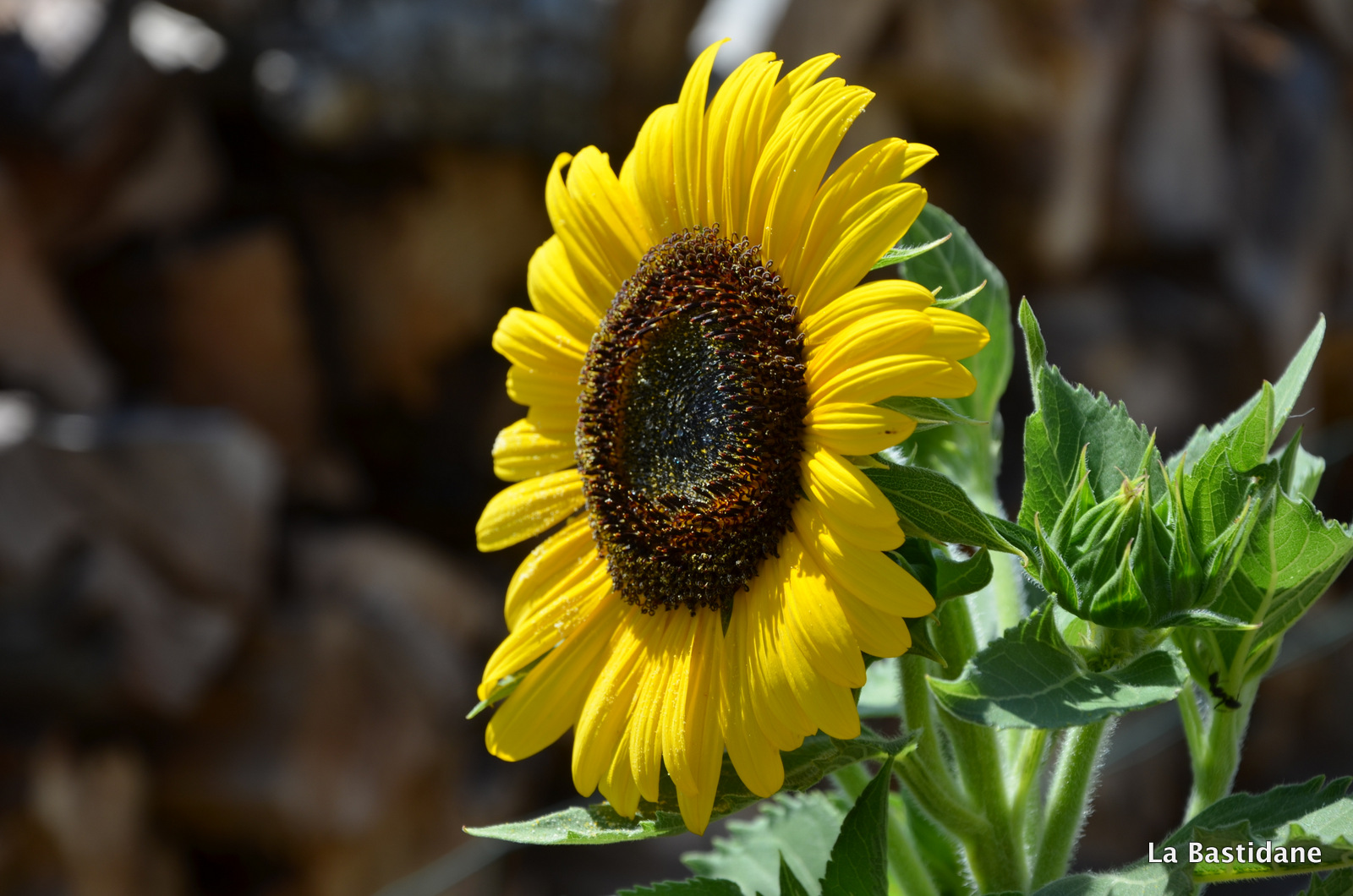 Il a poussé tout seul dans le jardin, un tournesol d’ornement, il est certainement arrivé grâce aux oiseaux … cinq ou six fleurs sont en train de préparer leur floraison … Une légende raconte que le tournesol est la fille du soleil. On dit qu’il y a des milliers d’années, le monde était partagé entre le Soleil (le jour) et les Etoiles et la Lune (la nuit)
