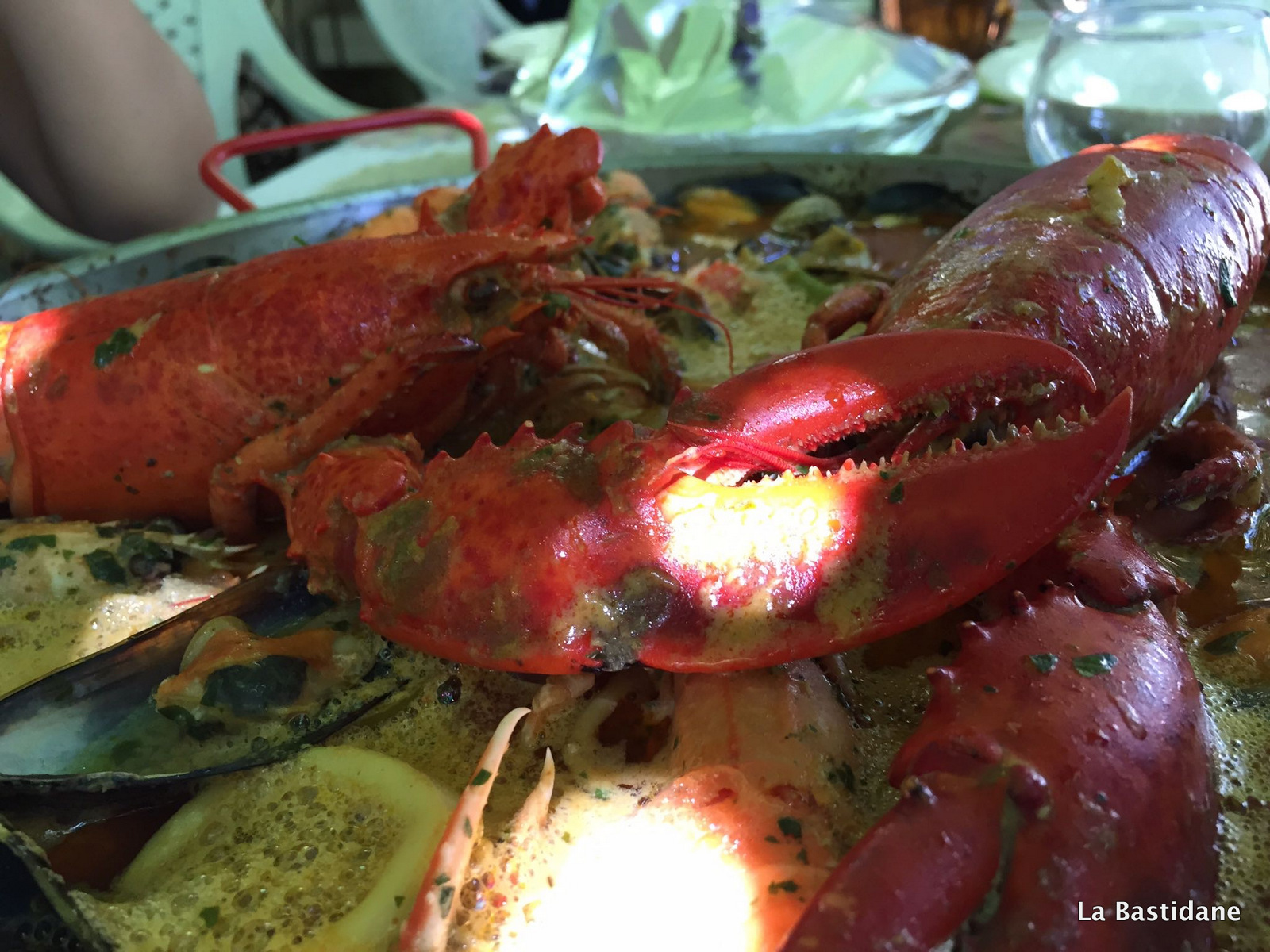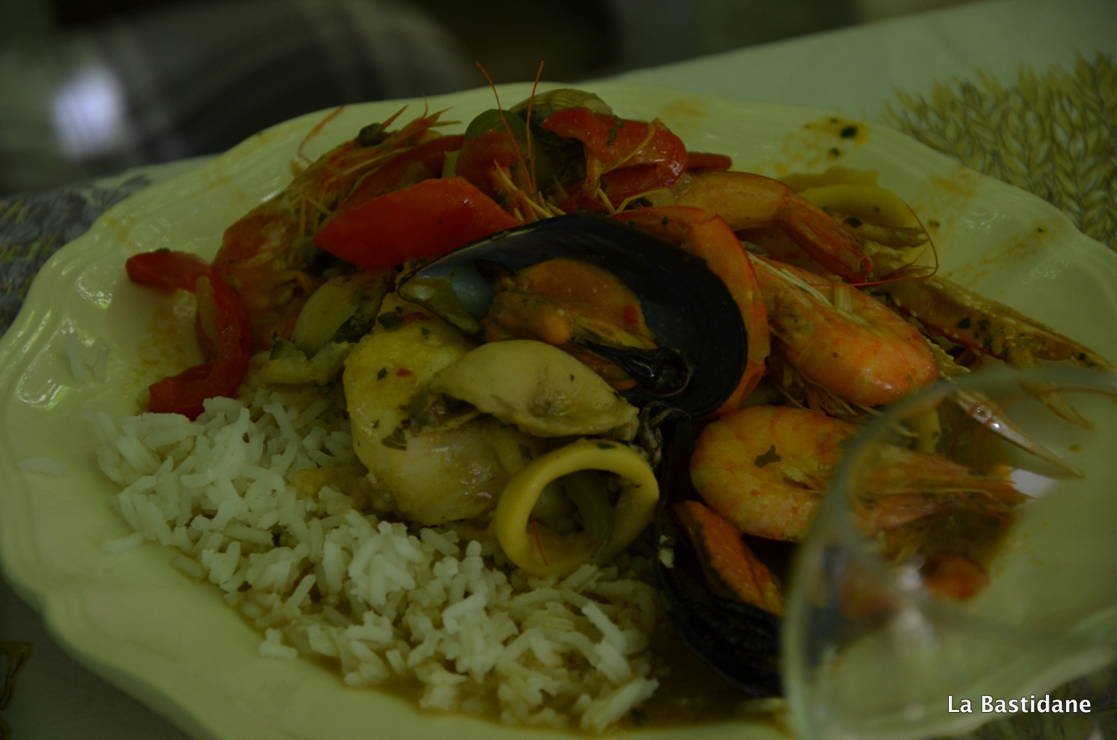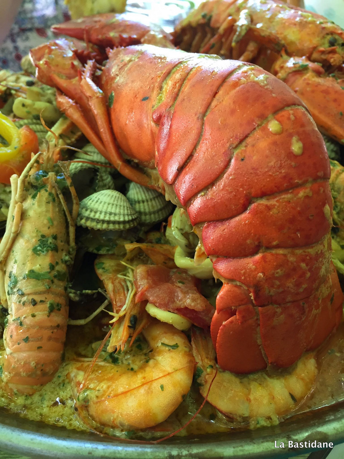 Rajouter de l’huile, toujours dans la même poêle, faire revenir, oignons, ail et persil et les laisser se colorer avec les poulpes, calmars, rajouter sel, poivre, safran, piment, tomates, fumé de poisson, le jus des moules, bisque homard, laisser mijoter 5 à 10 minutes et rajouter la crème liquide. Arroser le poisson de ce bouillon jusqu’à qu’ils soit couvert, et décorer avec les crevettes, moules et langoustes, remettre sur le feu 10 minutes, le temps que les coques (ou palourdes) s’ouvrent et servir aussitôt accompagné de riz blanc.