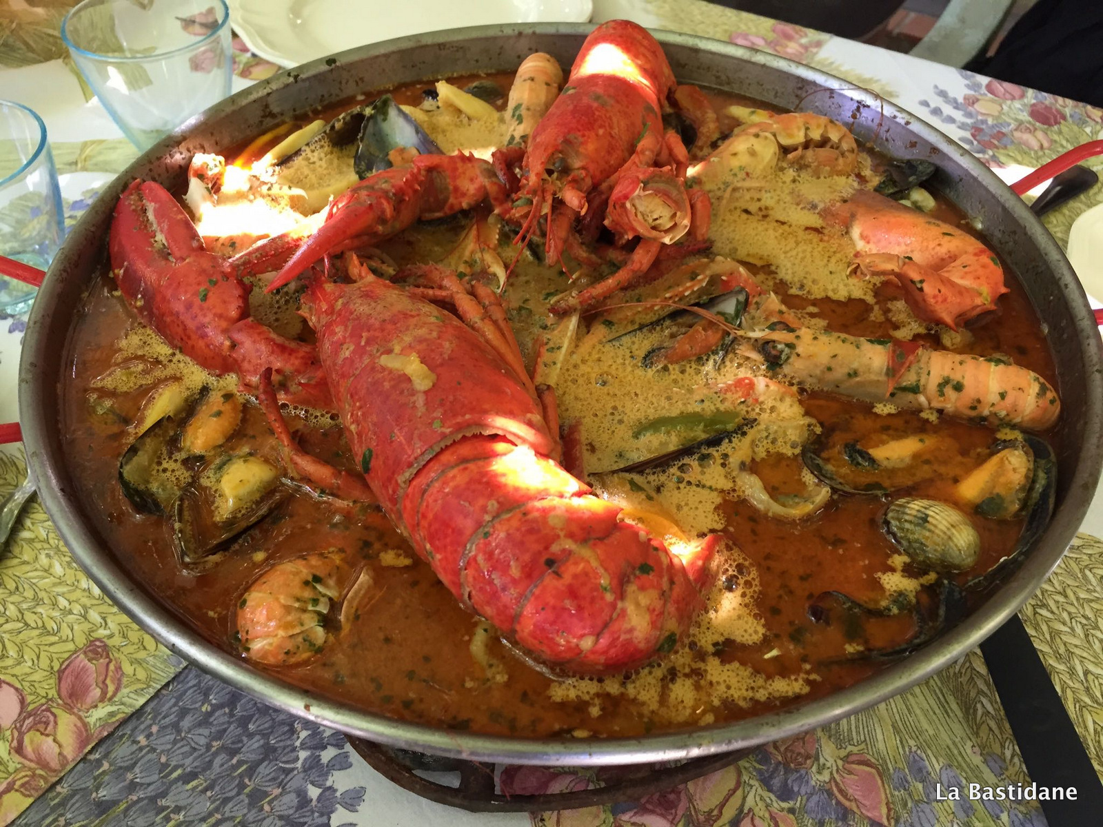 1 boite de bisque de homard, 2 boites de purée de tomates, ail, oignons, persil, huile d’olive, fumé de poisson, pincée de piment d’Espelette, Safran, 1 ou 2 briques de crème liquide, vin blanc pour les moules.