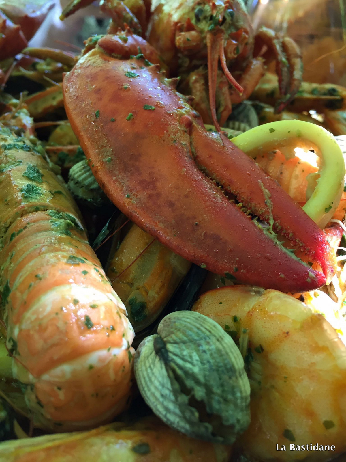 Dans la même poêle, faire revenir les langoustes, crevettes avec de l’ail et du persil et réserver.
