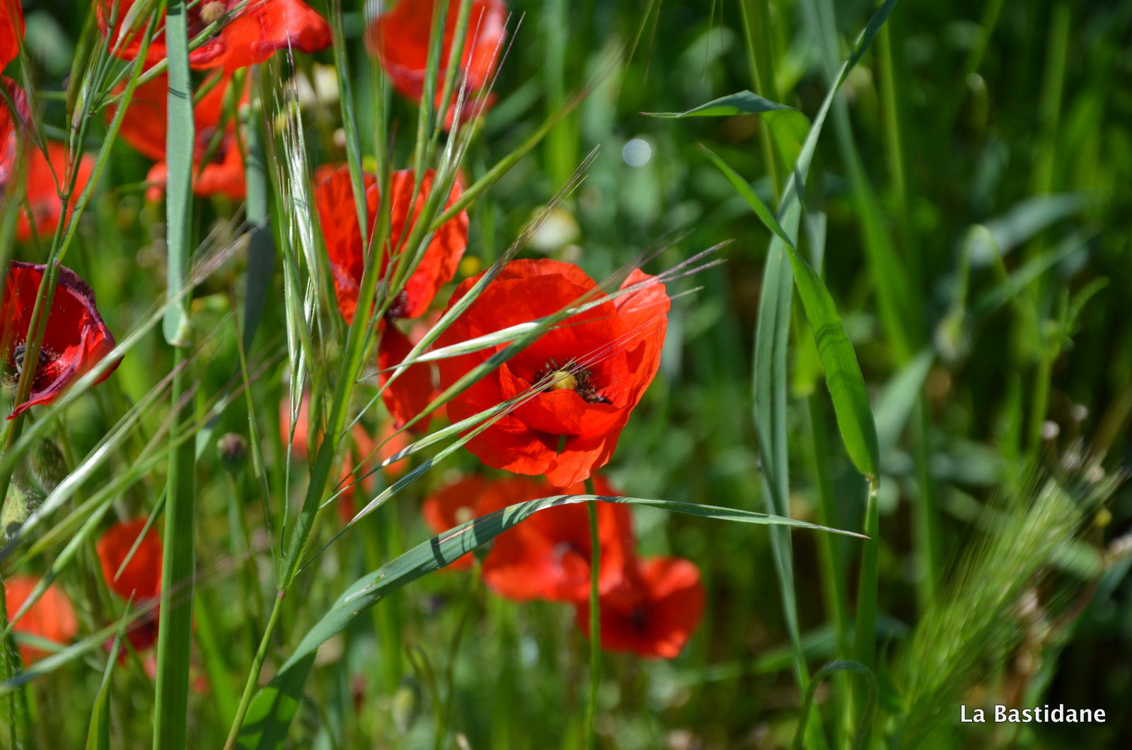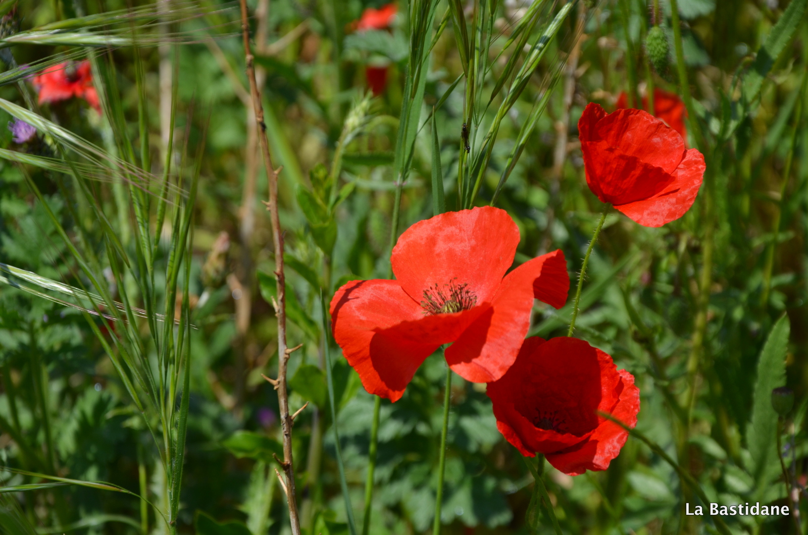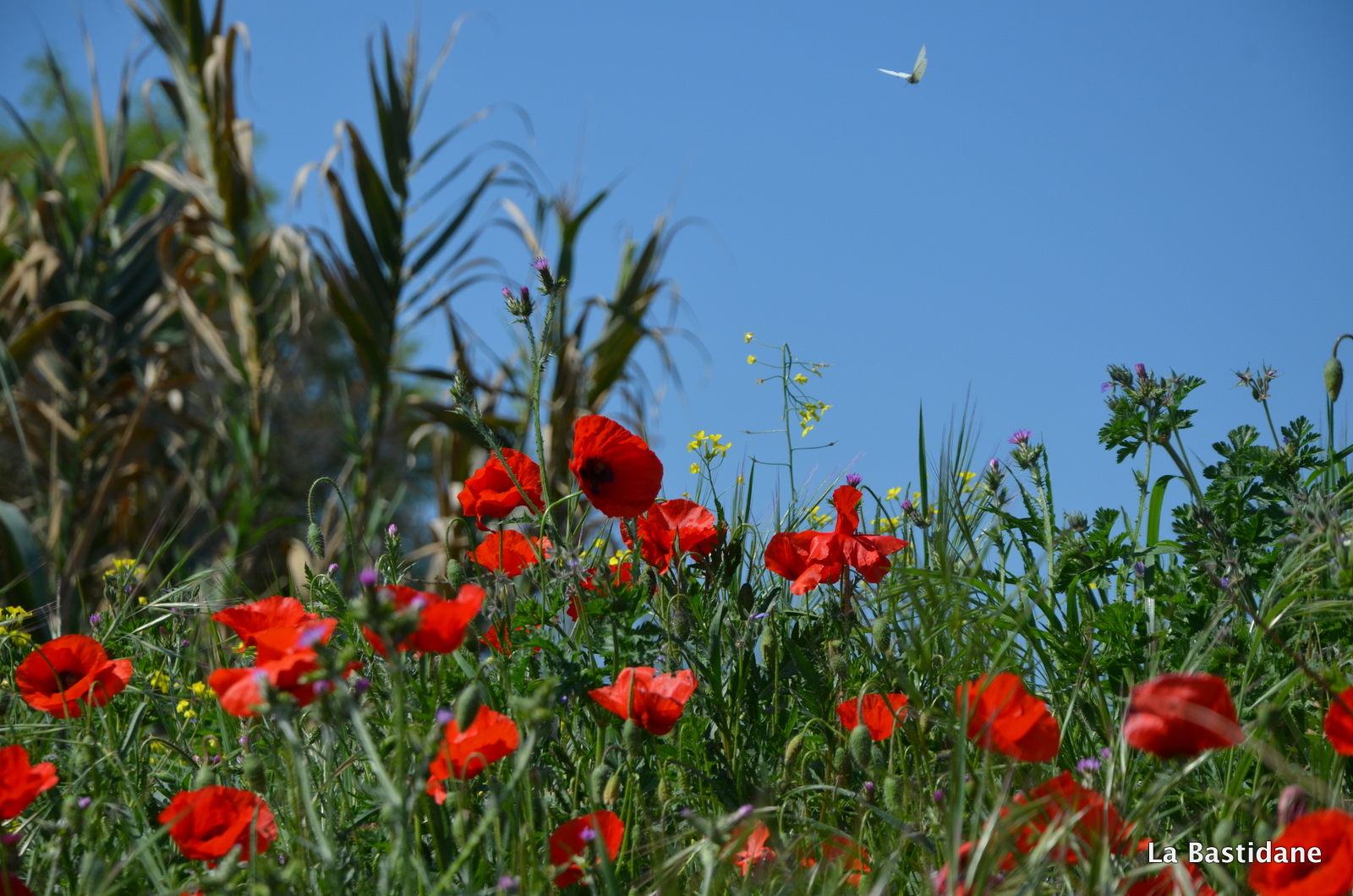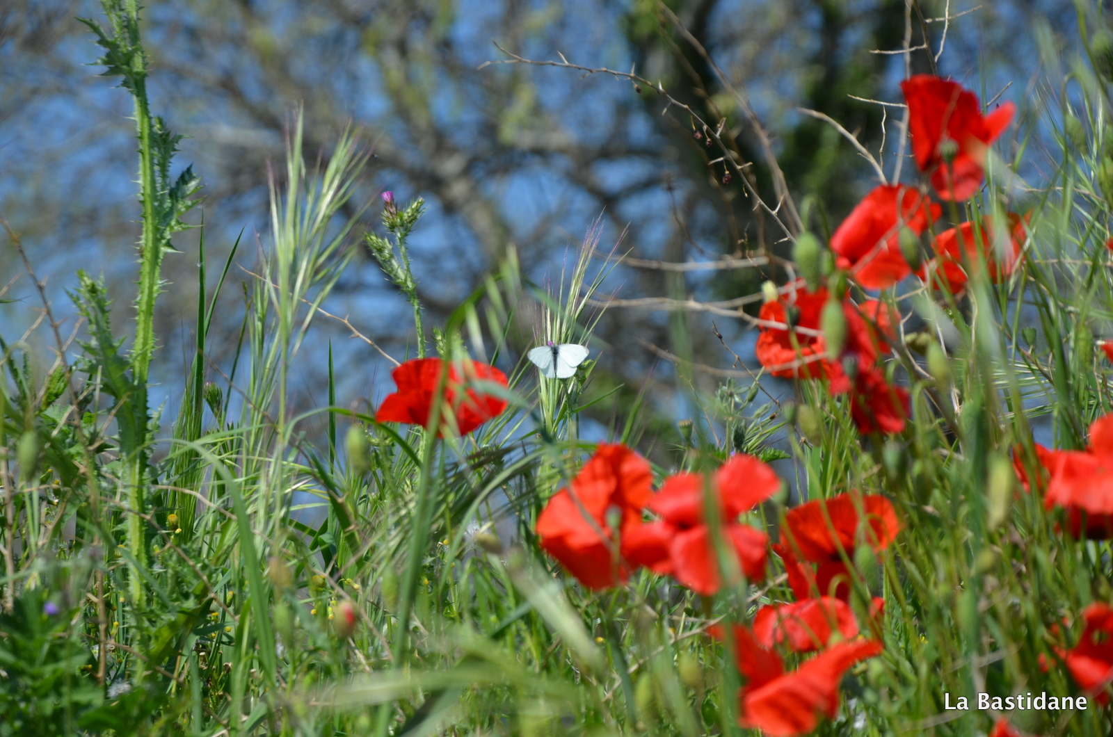 Ce matin en garant ma voiture, pour rejoindre mon bureau, j’ai vu du rouge au loin sur le talus qui sépare la rivière de la route et au bord de l’ascenceur …… oui parce qu’au milieu de la ville coule une rivière, l’Eze indocile, où les poules vont boire, j’aime les berges de la rivière. Ils étaient là, alors que dans la campagne pas un seul ne se dresse fièrement au bord des chemins, même pas une petite larme rouge au milieu des champs, peut être parce qu’il fait plus chaud au coeur de la cité, plus à l’abri, je n’en sais rien, mais les coquelicots ont envahi la ville. Ils m’ont attendu jusqu’à midi, et le ciel bleu aussi pour que je puisse les prendre à photo, un bourdon ici et là, un papillon blanc voletant et des oiseaux se disputant, on en oublie que l’on doit aller travailler, tout à notre envie, de suivre le sentier, et faire le bureau buissonnier …