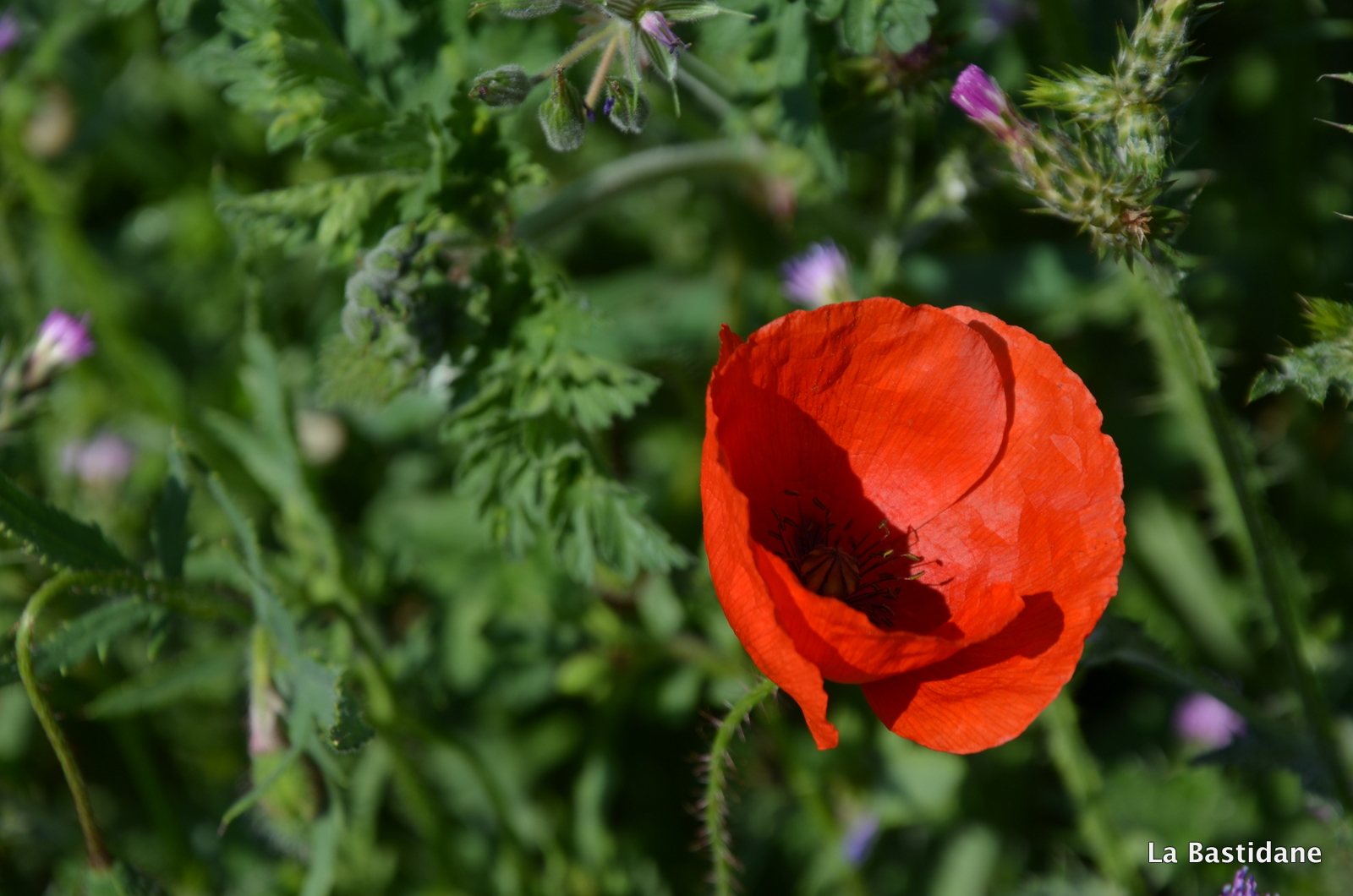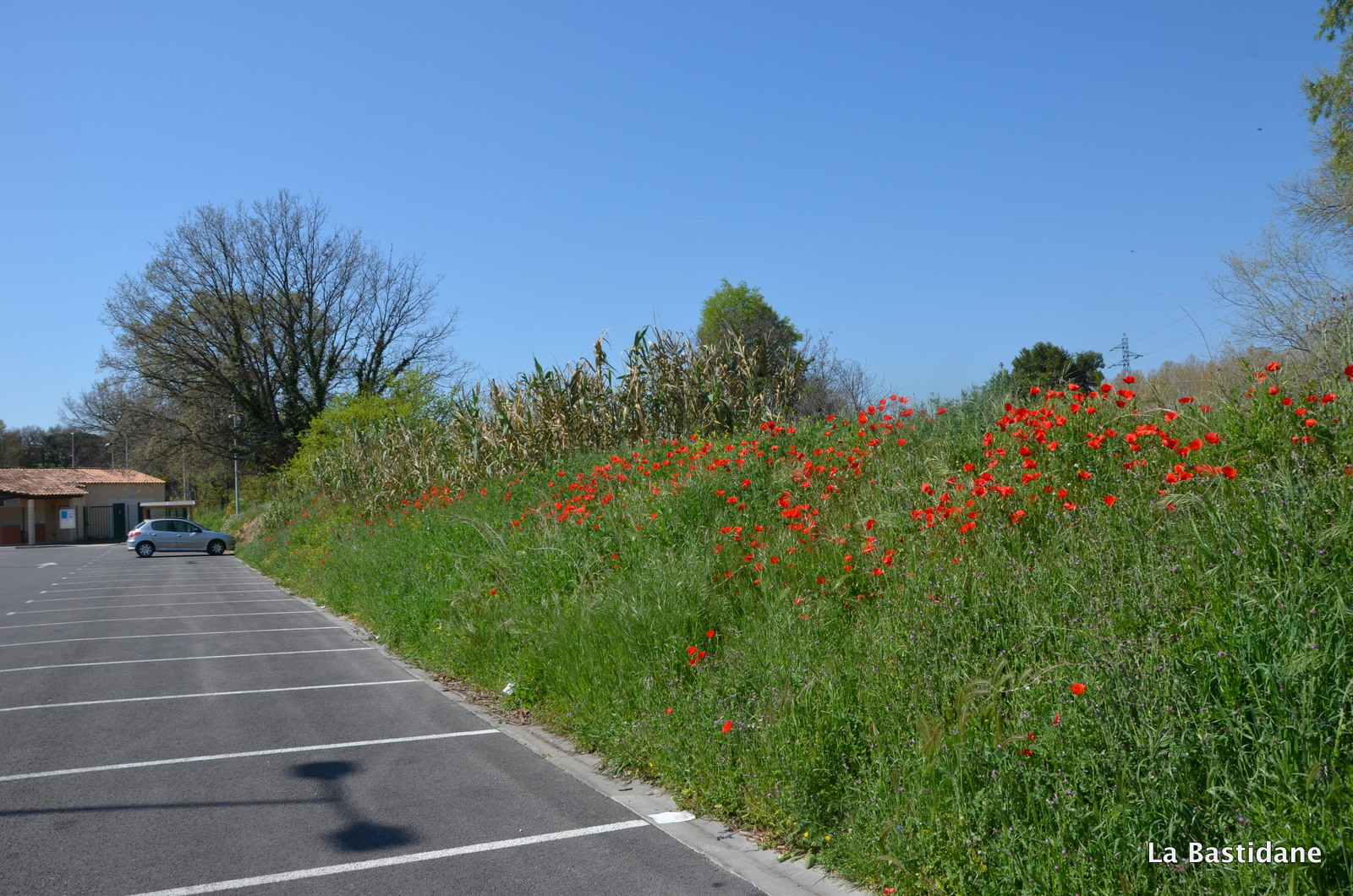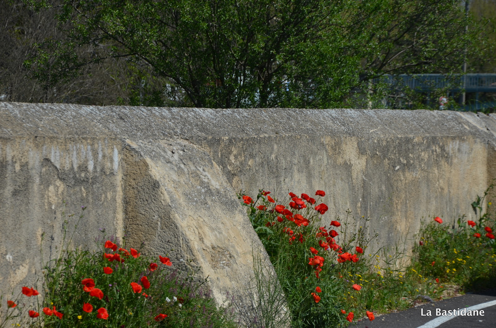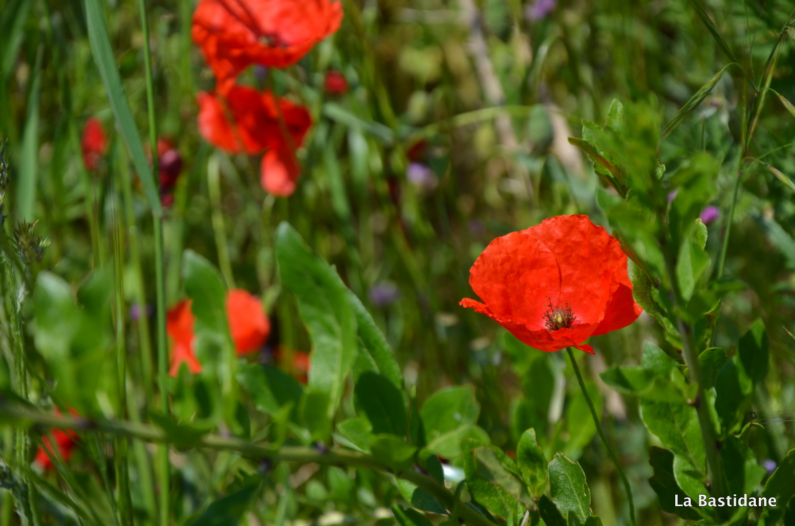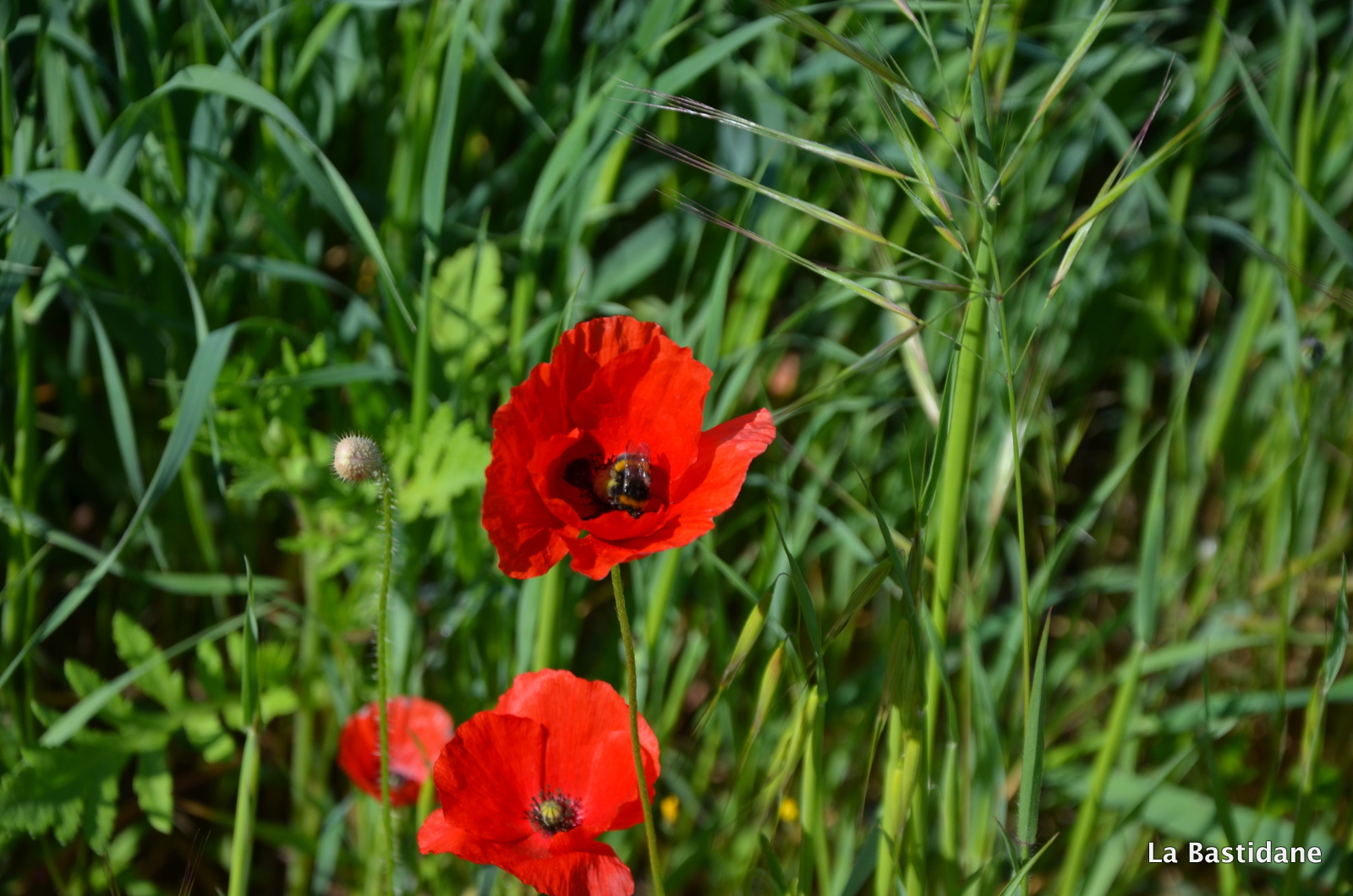 Ce matin en garant ma voiture, pour rejoindre mon bureau, j’ai vu du rouge au loin sur le talus qui sépare la rivière de la route et au bord de l’ascenceur …… oui parce qu’au milieu de la ville coule une rivière, l’Eze indocile, où les poules vont boire, j’aime les berges de la rivière. Ils étaient là, alors que dans la campagne pas un seul ne se dresse fièrement au bord des chemins, même pas une petite larme rouge au milieu des champs, peut être parce qu’il fait plus chaud au coeur de la cité, plus à l’abri, je n’en sais rien, mais les coquelicots ont envahi la ville. Ils m’ont attendu jusqu’à midi, et le ciel bleu aussi pour que je puisse les prendre à photo, un bourdon ici et là, un papillon blanc voletant et des oiseaux se disputant, on en oublie que l’on doit aller travailler, tout à notre envie, de suivre le sentier, et faire le bureau buissonnier …